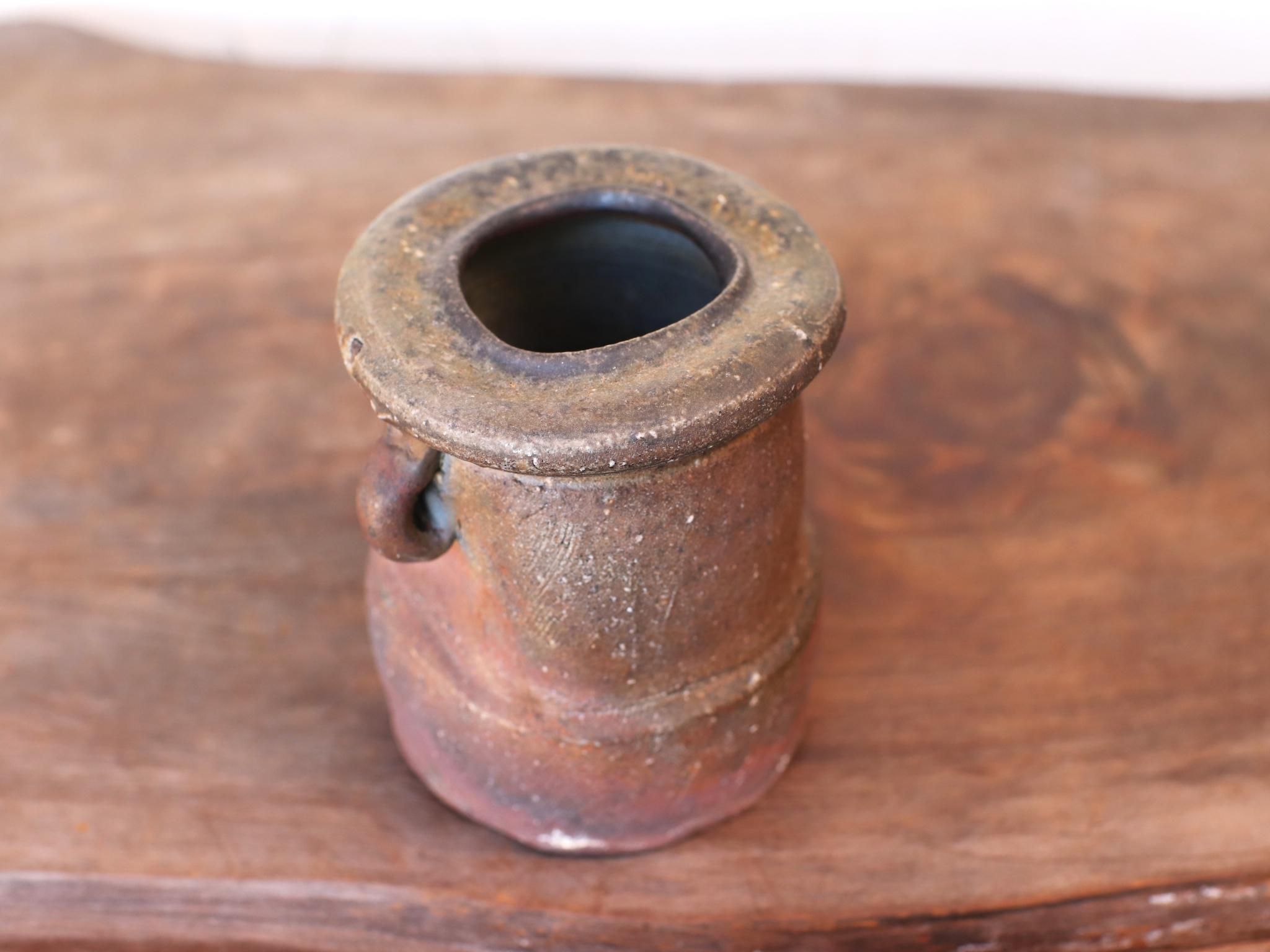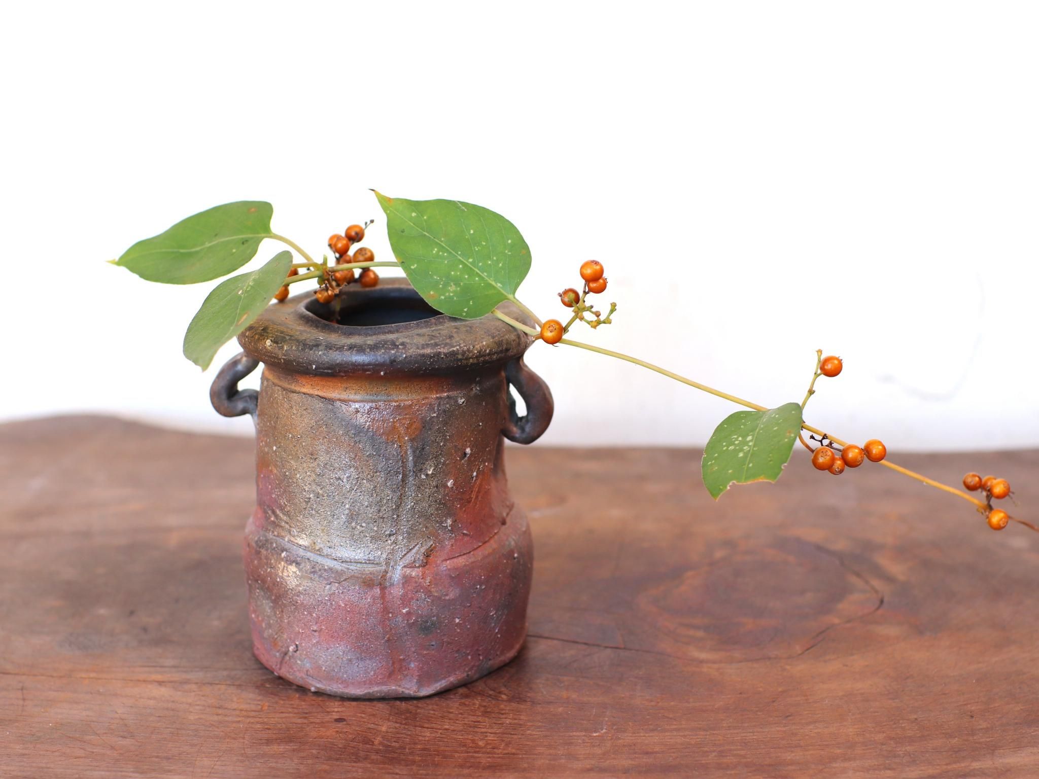 サンギリの耳付き花入れ。荒土を使用しているため土味がよく表れており、素朴で飾らない佇まいは、活けた花を引き立たせてくれます。